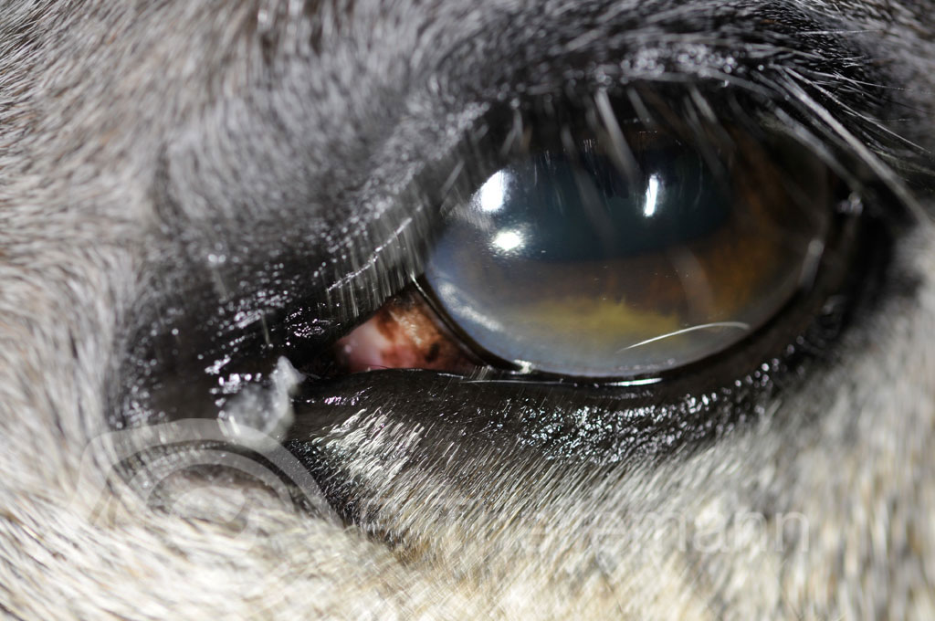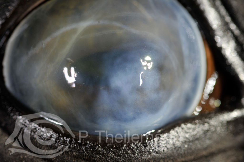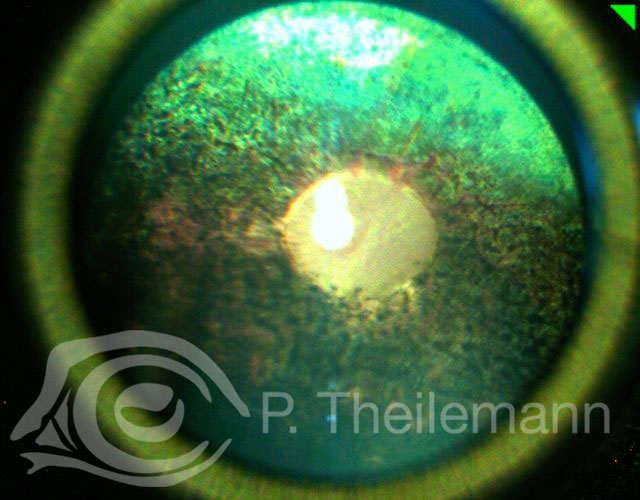 •Vitritis im Rahmen einer equinen rezidivierenden Uveitis mit entzündlichen Einlagerungen im Glaskörper