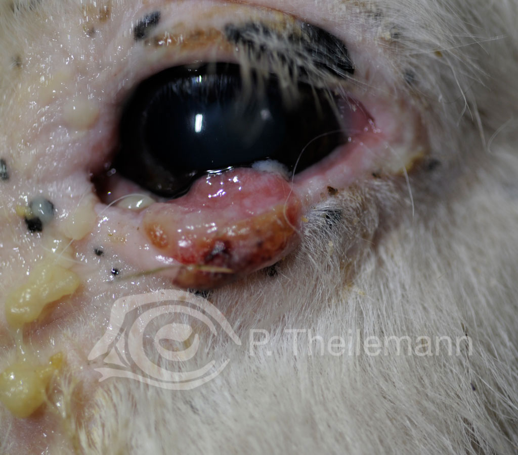 •Entzündungen (Blepharitis durch Bakterien, Pilze, Parasiten; Phlegmone; Insektenstiche; Allergien). Typische Symptome sind Rötung, Schwellung, Depigmentierung und Ablagerungen